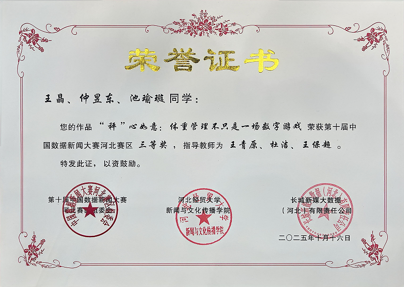 本次大赛由中国数据新闻大赛暨AIGC应用大赛组委会主办,河北经贸大学新闻与文化传播学院和长城新媒体集团大数据产业中心联合承办,首次增设AIGC赛道,以响应国家战略部署,推动智能技术与新闻实践的深度融合。大赛自启动以来共吸引河北省内10余所高校300余名学子参与,作品涵盖乡村振兴、文化遗产等多元主题,展现数据叙事与智能技术的创新应用。经专业评审,最终32件作品获得省赛奖项,我院王晶、仲昱东、池瑜璇同学首次参赛表现不俗,其作品《“秤”心如意:体重管理不只是一场数字游戏》荣获该项赛事三等奖。