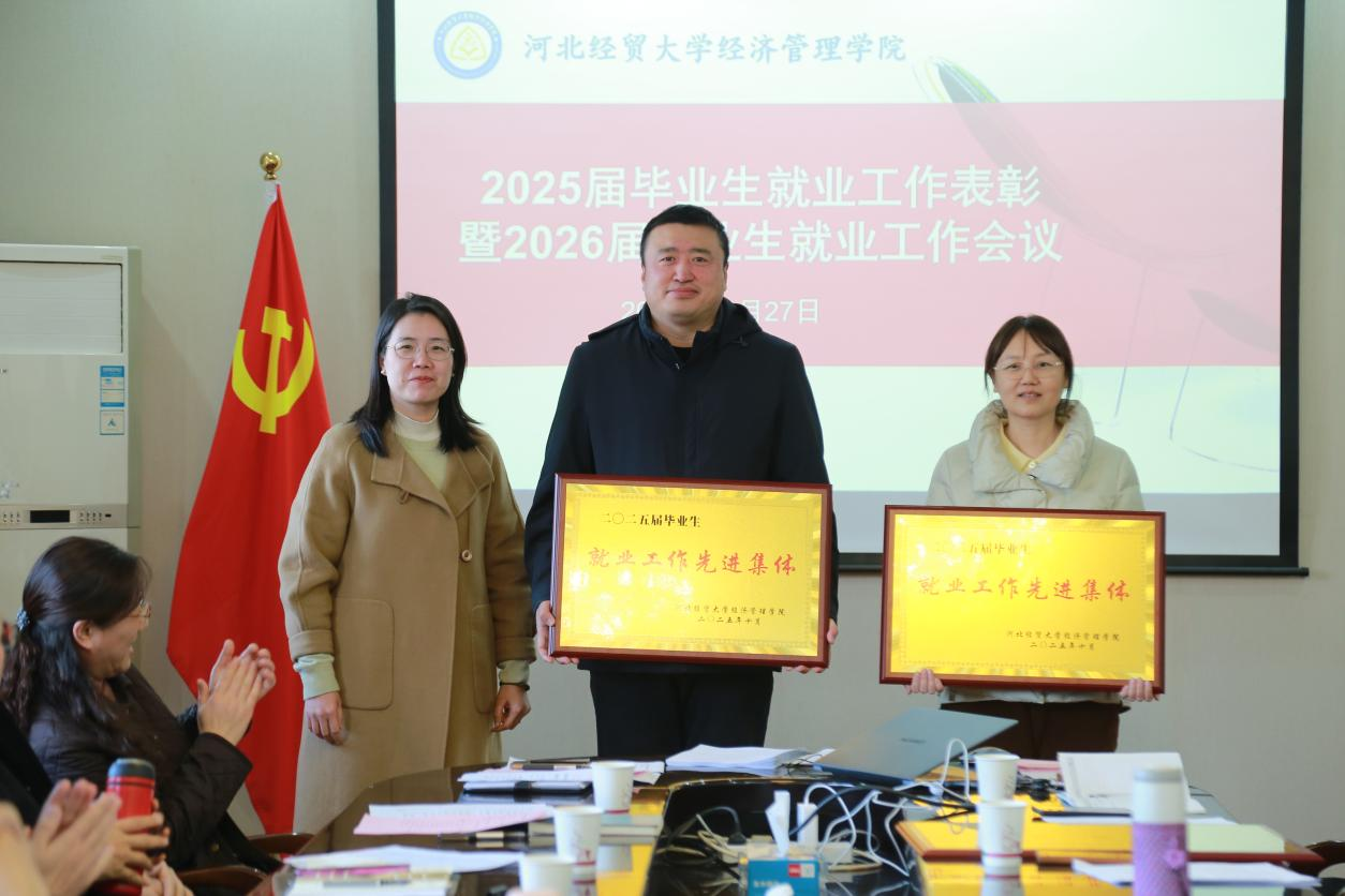 副院长王鸿喜宣读了《关于表彰2025届毕业生就业创业工作先进集体和先进个人的决定》。乔蕾、李欣、崔龙等7人荣获“就业先进个人”称号,王琪、李珊、樊璠荣获“考研先进个人”称号,信息系荣获“2025年就业日常优秀集体”,商务系、会计系获得“2025届毕业生考研先进集体”称号,信息系、商务系获得“2025届毕业生就业先进集体”称号。学院领导为获奖集体和个人代表颁发了荣誉证书。就业先进集体代表信息系和就业先进个人代表徐凯旋分别发言,分享了他们在拓展就业渠道、实施全过程就业指导、开展精准帮扶等方面的有效做法和宝贵经验。
