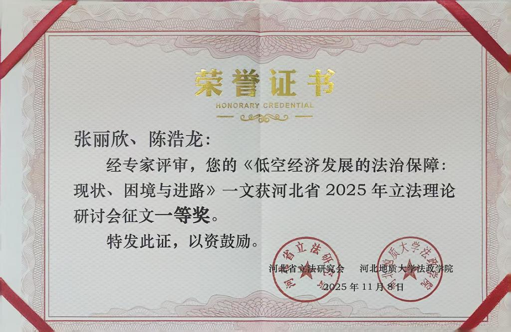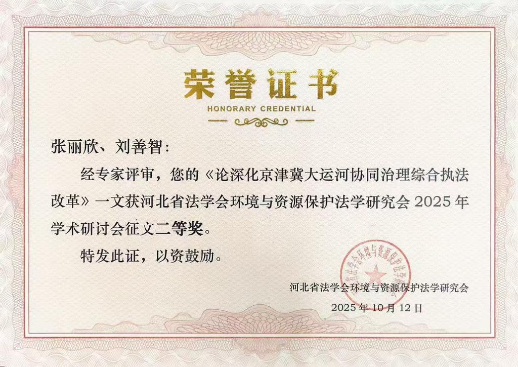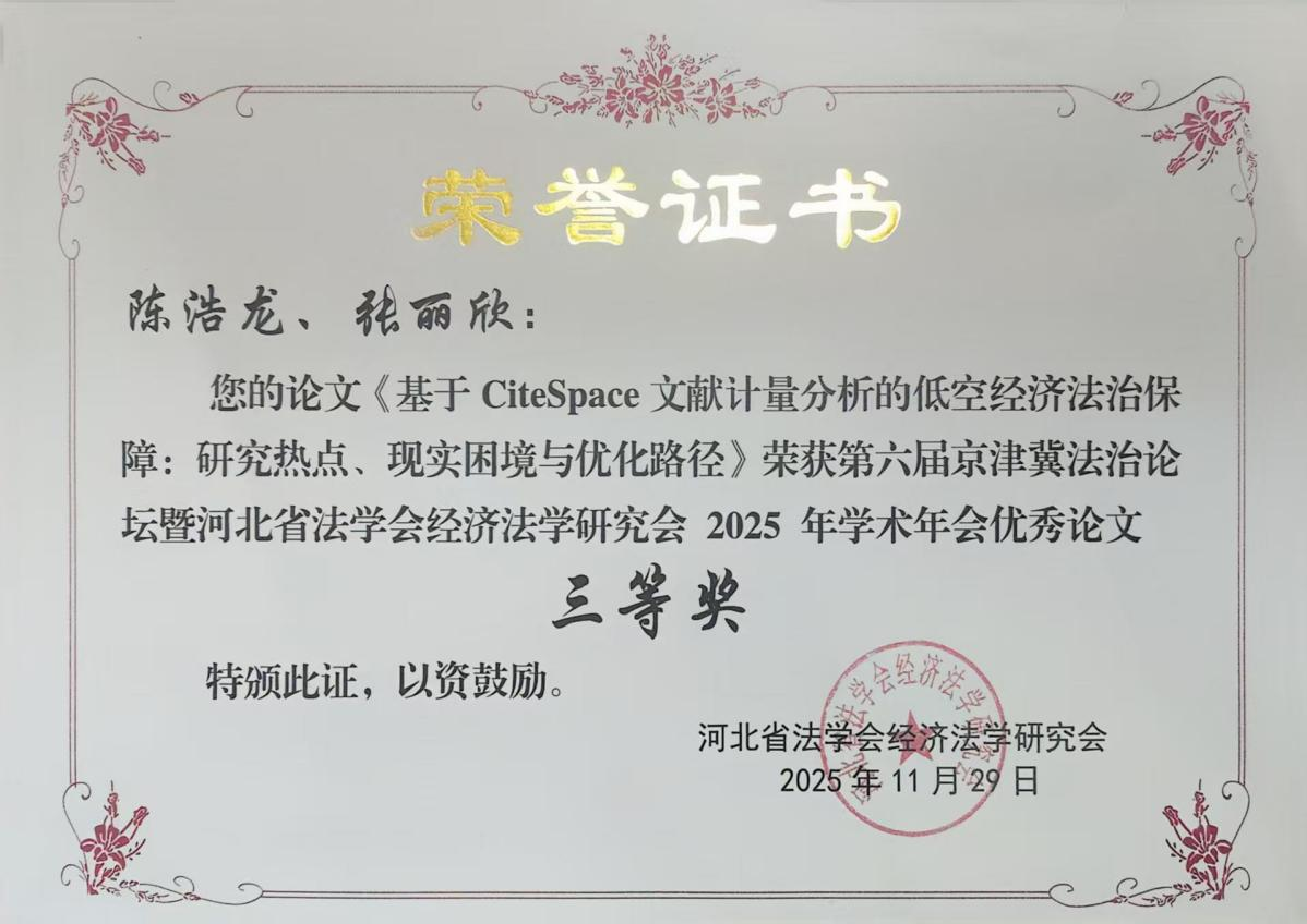 2025年,文法系学生向多个学术年会、论坛和研讨会提交学术论文并获奖。其中,陈浩龙同学的论文《低空经济发展的法治保障:现状、困境与进路》荣获河北省2025年立法理论研讨会优秀论文一等奖,《京津冀经济协同立法的问题检视与创新路径研究》荣获河北省法学会法理学研究会2025年年会优秀论文二等奖,《基于CiteSpace 文献计量分析的低空经济法治保障:研究热点、现实困境与优化路径》荣获第六届京津冀法制论坛暨河北省法学会经济法学研究会2025年学术年会优秀论文三等奖;刘善智同学的论文《校园欺凌防治的地方立法探索——以〈河北省校园欺凌防治条例〉制定为例》和《建立与完善京津冀低空经济协同立法机制研究》分获河北省法学会立法学研究会2025年年会优秀论文二等奖、三等奖,《综合执法改革驱动下京津冀大运河协同治理困境与破解路径》荣获第三届京津冀协同发展法治论坛征文优秀奖,《论深化京津冀大运河协同治理综合执法改革》获河北省法学会环境与资源保护法学研究会2025年学术研讨会征文二等奖,《新质生产力背景下的京津冀区域低空经济协同立法路径设计》在2025年天津市法学会科技法学分会年会征文中获二等奖。