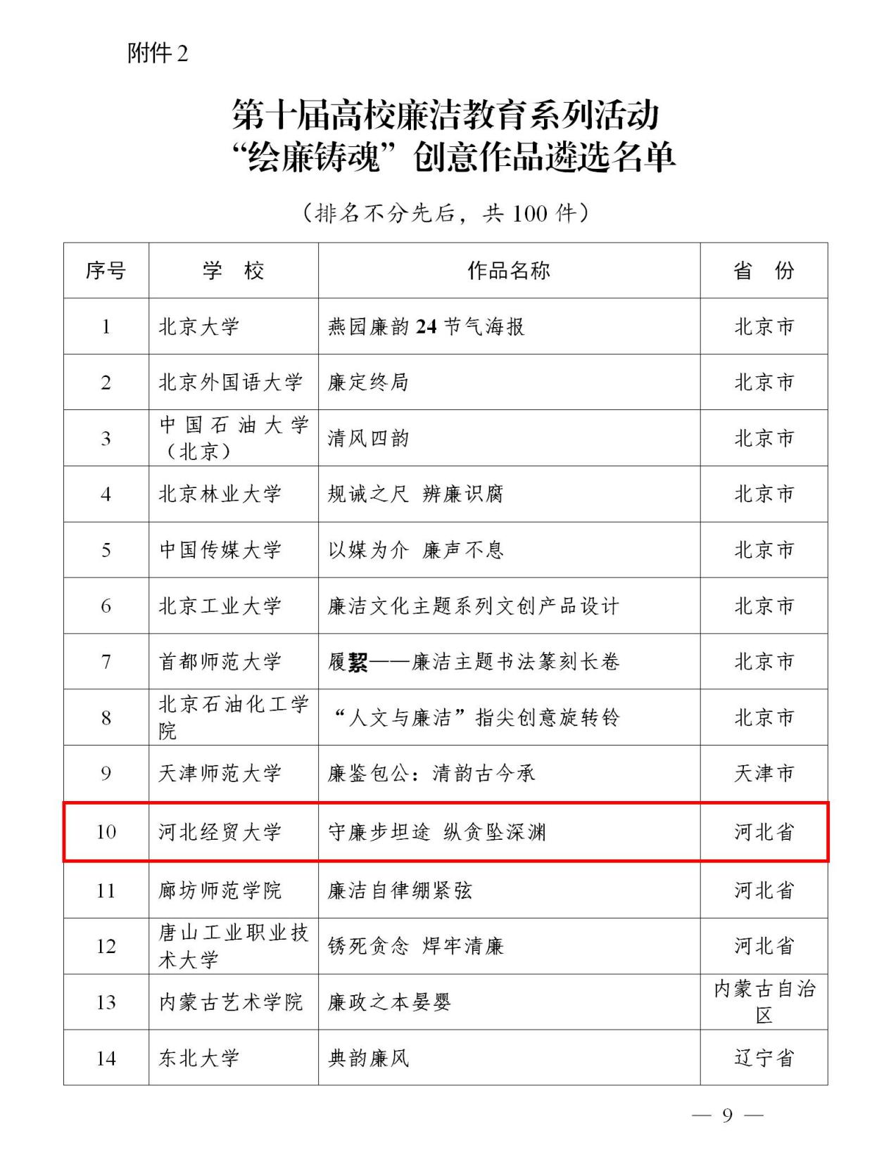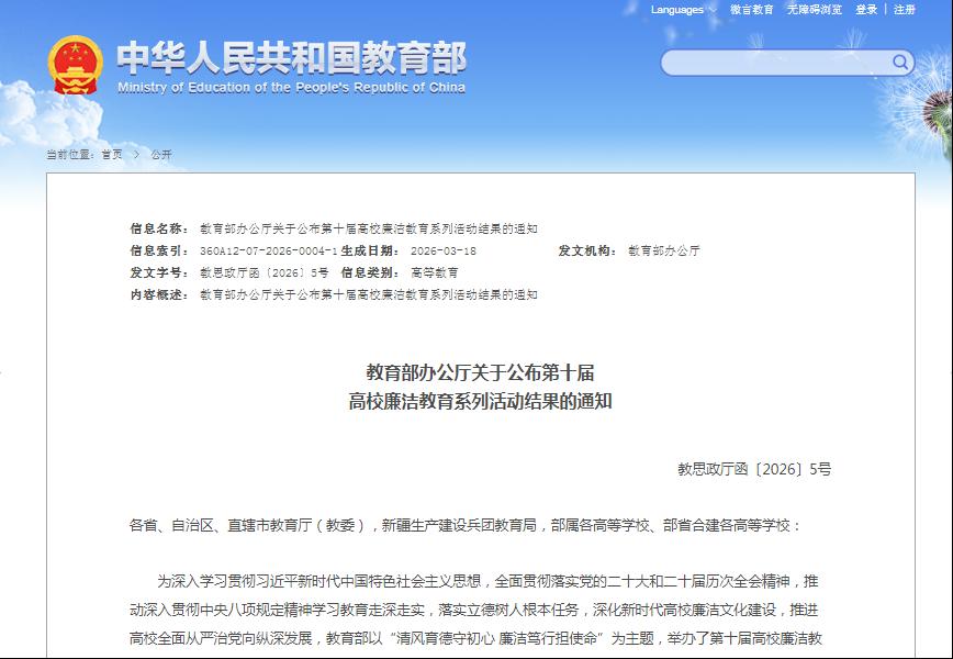 去年6月,教育部以“清风育德守初心 廉洁笃行担使命”为主题,举办了第十届高校廉洁教育系列活动。经自主申报、省级审核和专家评审,全国共评选出844件优秀作品,涵盖征文、创意设计、视频、廉洁课、实践课等多种形式,其中“绘廉铸魂”创意优秀作品100件。据悉,此次优秀作品将通过中国教育电视台、全国高校思想政治工作网等平台集中展示。