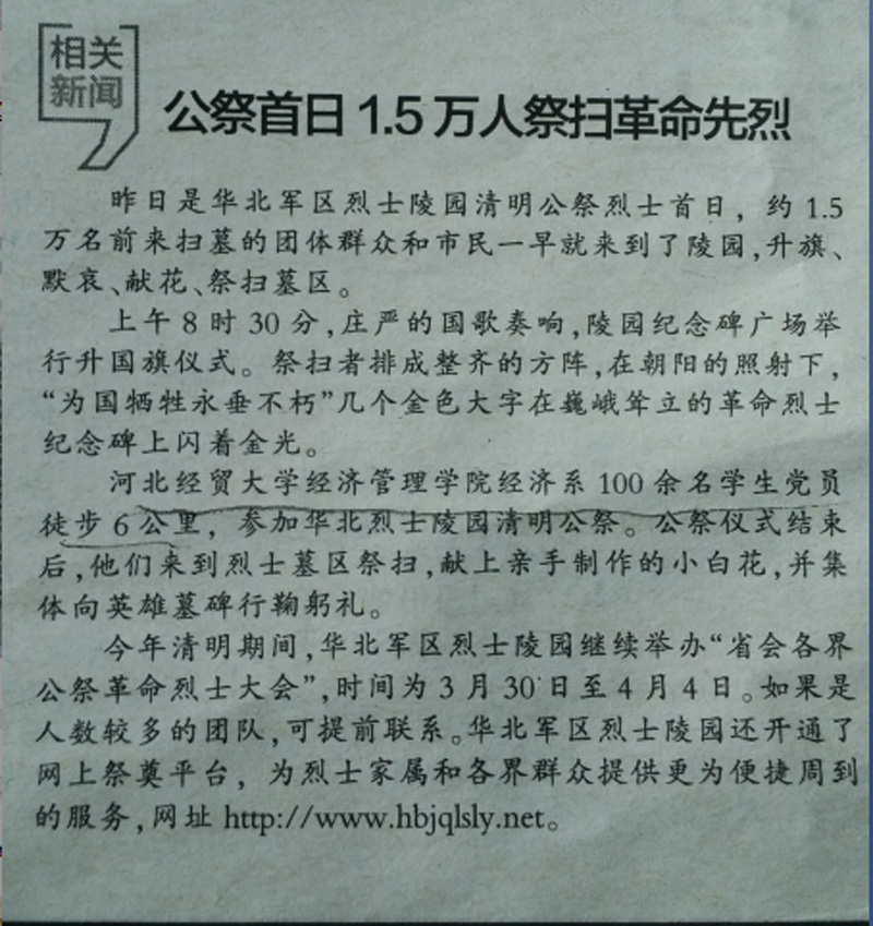 英雄浩气,山河永在;烈士忠魂,日月同辉。3月30日上午,我院经济系100余名师生党员,在系党总支书记郑学栋的带领下,徒步六公里,参加华北烈士陵园清明公祭。
