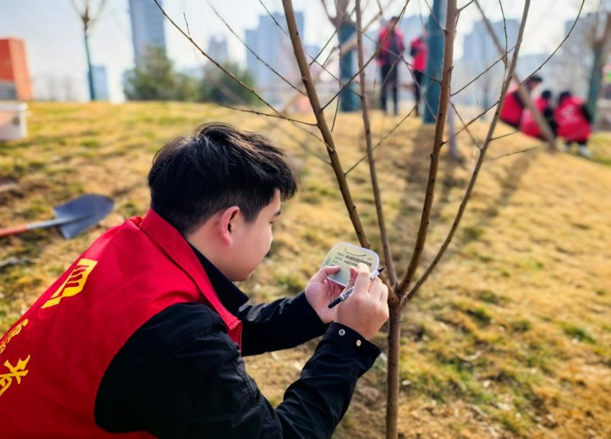 活动现场春意盎然、秩序井然。在园林工作人员的专业指导下,同学们迅速分组、分工协作,挥锹挖坑、扶苗定植、提水浇灌,每一道工序都认真细致、一丝不苟,大家干劲十足、默契配合。每种一棵树,都悬挂专属树牌,以小小铭牌定格劳动瞬间。