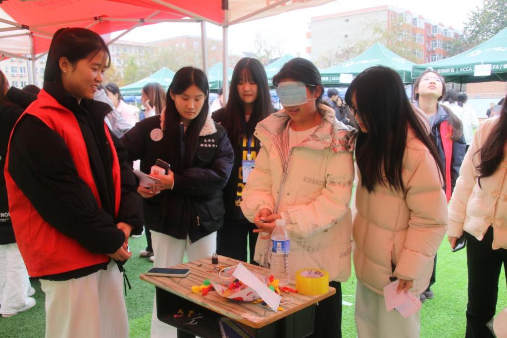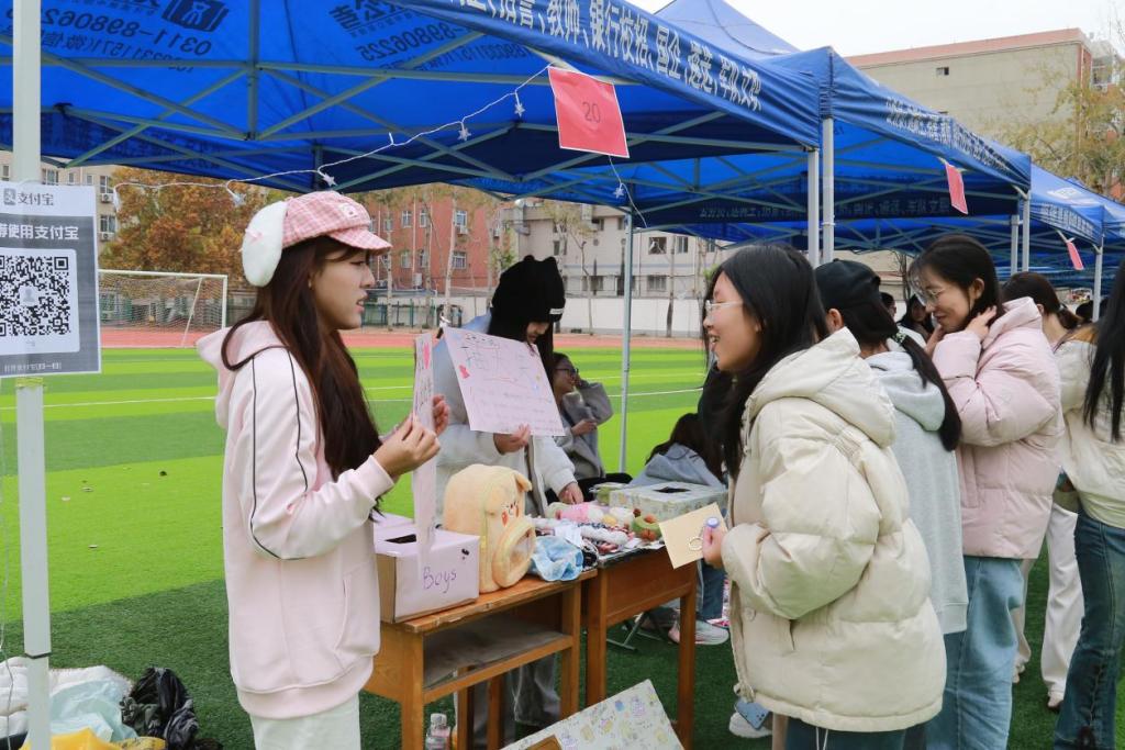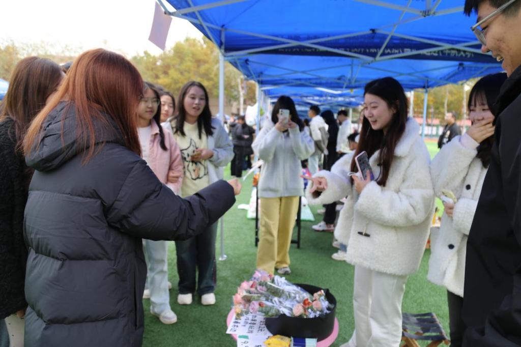 24金科一班的手工绒线花艺摊位人气颇高,其创意源于宿舍同学的集思广益,从“想法”到“产品”的制造过程,正是劳动创造价值的生动体现。23级工商2班韩宏伟同学的“创意盲盒”摊位成为全场焦点之一,他介绍道:“我们前期做了简单的市场调研,发现‘小成本、大惊喜’的模式最受同学欢迎。3元的定价策略、抽奖的促销方式,都经过了监管小组的报备与认可,让大家买得放心、玩得开心。”在时尚专区和生活用品区,同学们带来的特色美甲、精致小物也备受青睐,从原材料采购到成品制作、定价销售,这一完整的劳动过程让同学们深刻体会到创造与经营的不易。